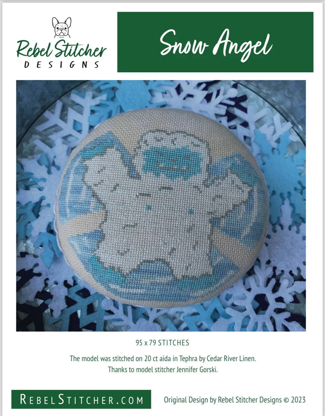 This printed cross stitch pattern by Rebel Stitcher features a playful yeti making snow angels. As stitched it uses Classic Colorworks Cotton and Gentle Arts Sampler floss.
