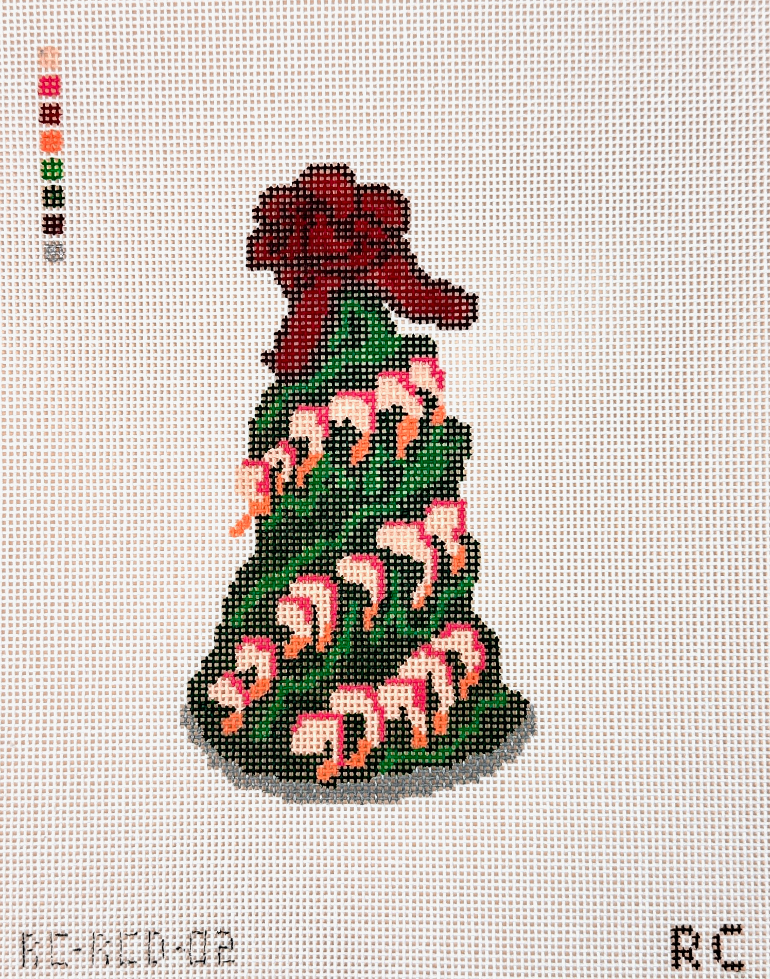 This is a needlepoint canvas from RenniCo. It features a festive shrimp tree made with fresh kale and shrimp! Inspired by mid-century holiday feasts, this design combines the unexpected combo of vibrant kale and plump shrimp, creating a fun and playful take on traditional holiday décor. Perfect for those who love a bit of kitsch and a whole lot of holiday cheer, this piece will surely brighten up any space with its whimsical appeal.