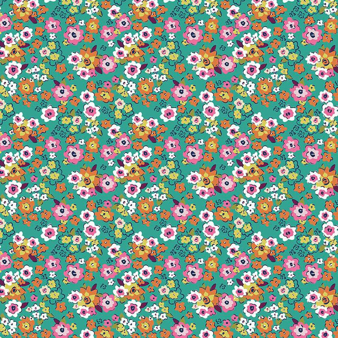 This cotton fabric from Riley Blake Designs features a cheerful floral on a teal background.