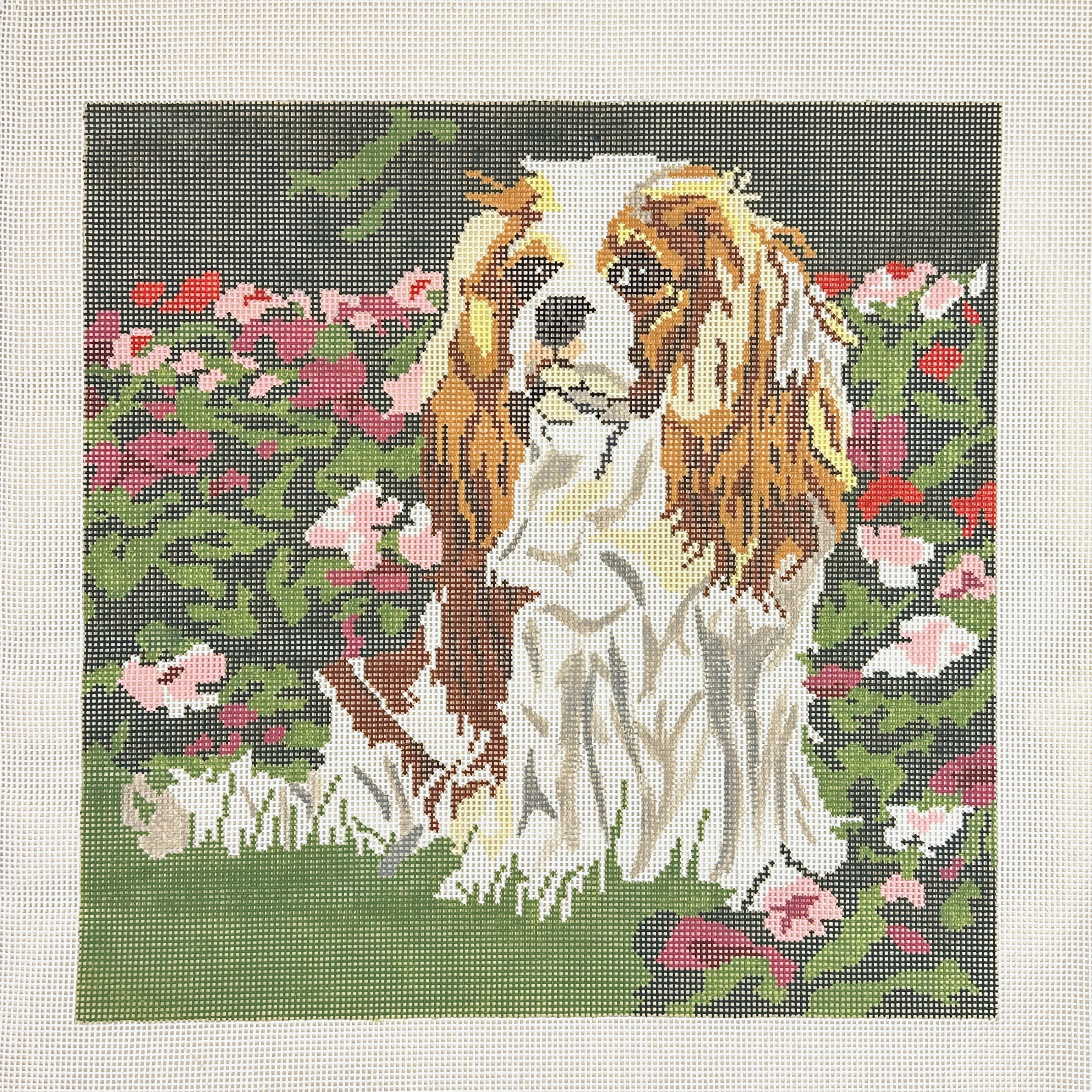 This hand painted needlepoint canvas features a pretty Cavalier King Charles Spaniel named Monica.