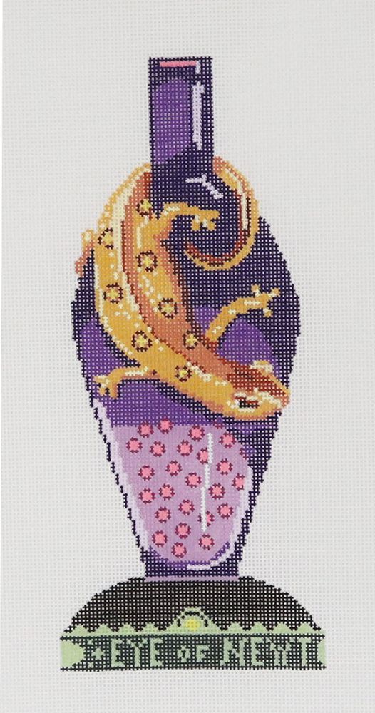 A beautiful hand painted needlepoint canvas from Rittenhouse Needlepoint. Spooky Halloween bottle encourages stumpwork.