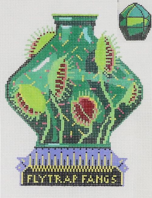 A beautiful hand painted needlepoint design from Rittenhouse Needlepoint. Spooky Halloween bottle encourages stumpwork.