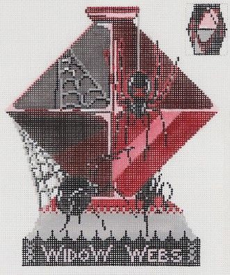 A beautiful hand painted needlepoint canvas from Rittenhouse Needlepoint. Spooky Halloween bottle encourages stumpwork.