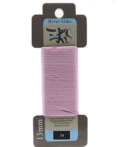 This is 13mm Ribbon from River Silks in color 054 Moonlight Mauve. Perfect for silk ribbon embroidery, on fabric or on canvas. Excellent for adding ruffles and dimensional flowers!