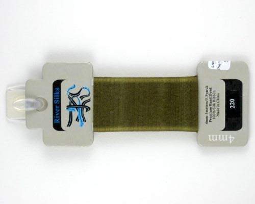 This is 4mm Ribbon from River Silks in color 220 Olive Green. Perfect for silk ribbon embroidery, on fabric or on canvas. Excellent for adding ruffles and dimensional flowers!