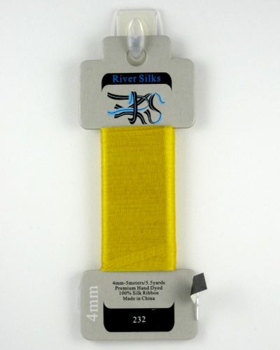 This is 4mm Ribbon from River Silks in color 232 Vibrant Yellow. Perfect for silk ribbon embroidery, on fabric or on canvas. Excellent for adding ruffles and dimensional flowers!