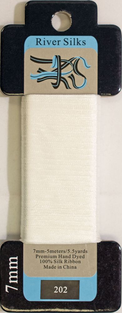 This is 7mm Ribbon from River Silks in color 202 White White. Perfect for silk ribbon embroidery, on fabric or on canvas. Excellent for adding ruffles and dimensional flowers!