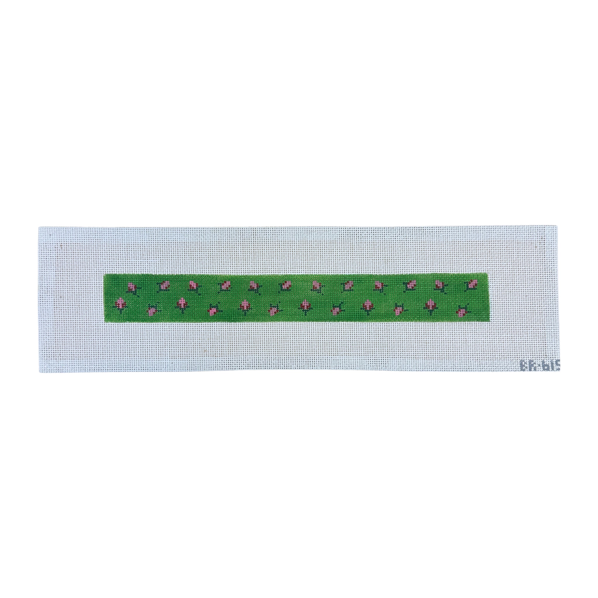This hand painted dog collar needlepoint canvas features a vibrant green background with pink rose buds.