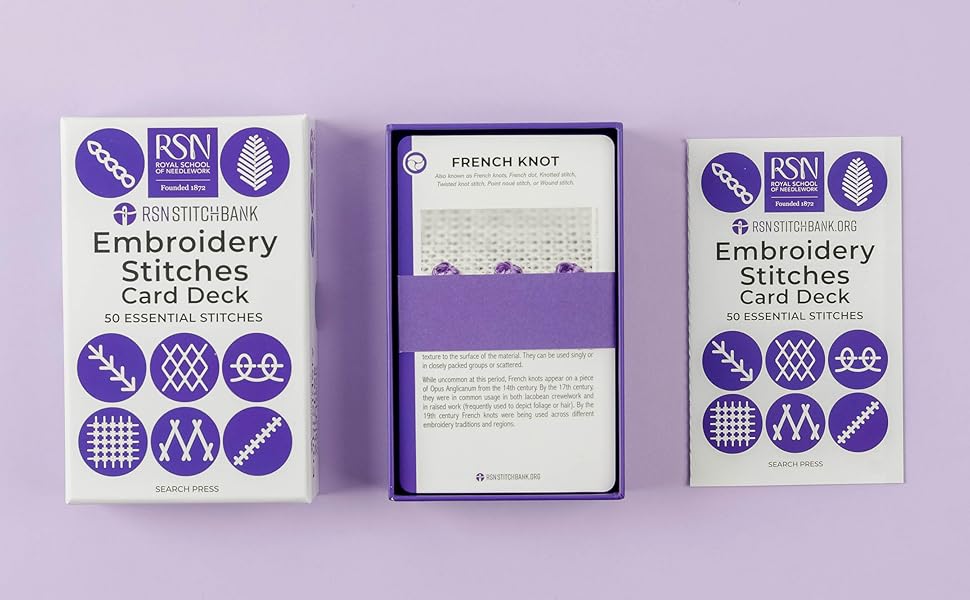 The deck’s contents has been expertly curated by the Royal School of Needlework, the world’s pre-eminent embroidery experts, and supports the RSN’s groundbreaking online Stitch Bank. The RSN Stitch Bank launched in September 2021 by revealing the first 150 stitches as the official opening of the RSN’s 150th anniversary celebrations. More stitches are added regularly and the RSN work with partners around the world to include stitches from different traditions. The Stitch Bank currently includes more than 500 stitches, divided across 28 disciplines, from crewel embroidery to whitework.