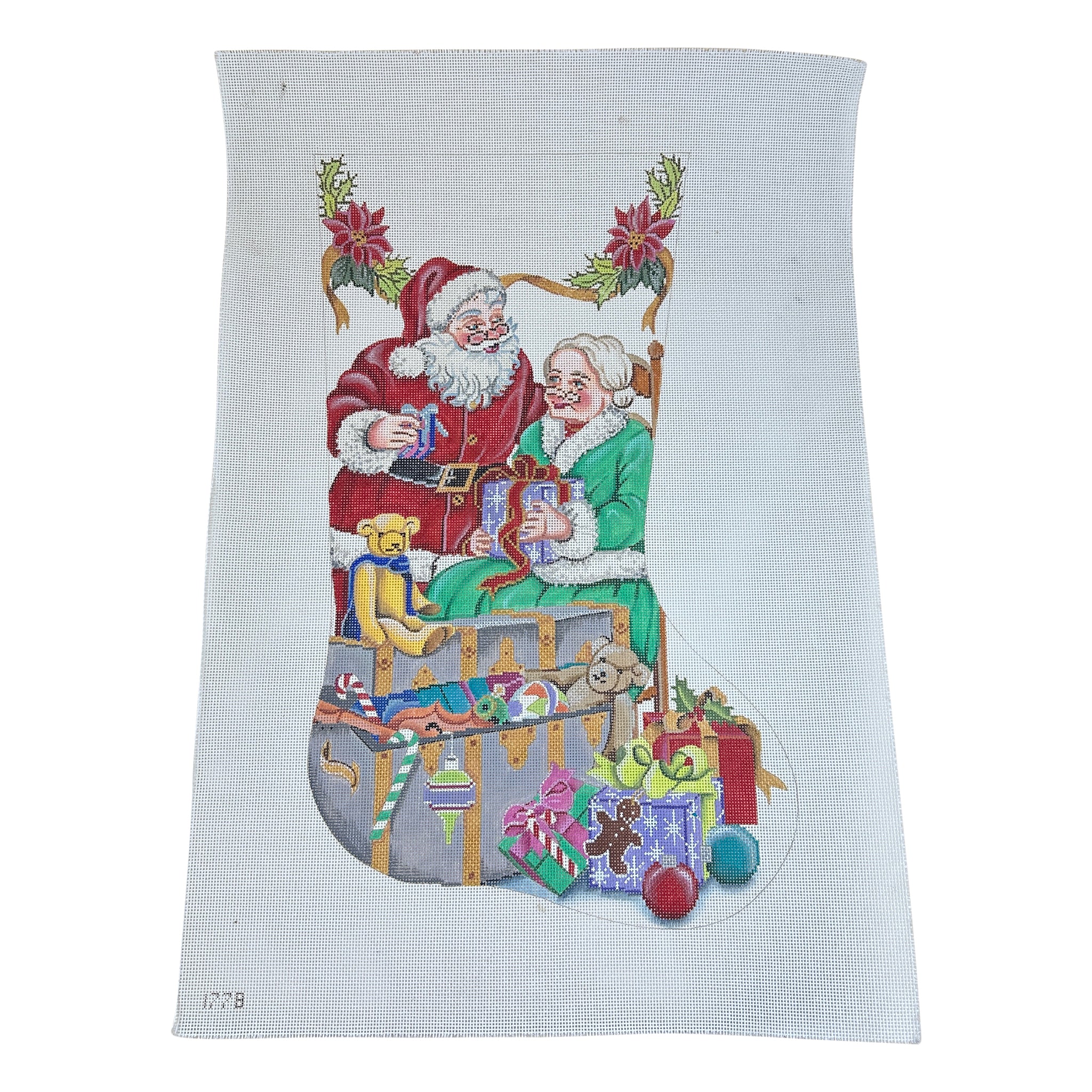 This hand painted stocking needlepoint canvas features Santa and Mrs Claus surrounded by gifts and toys.