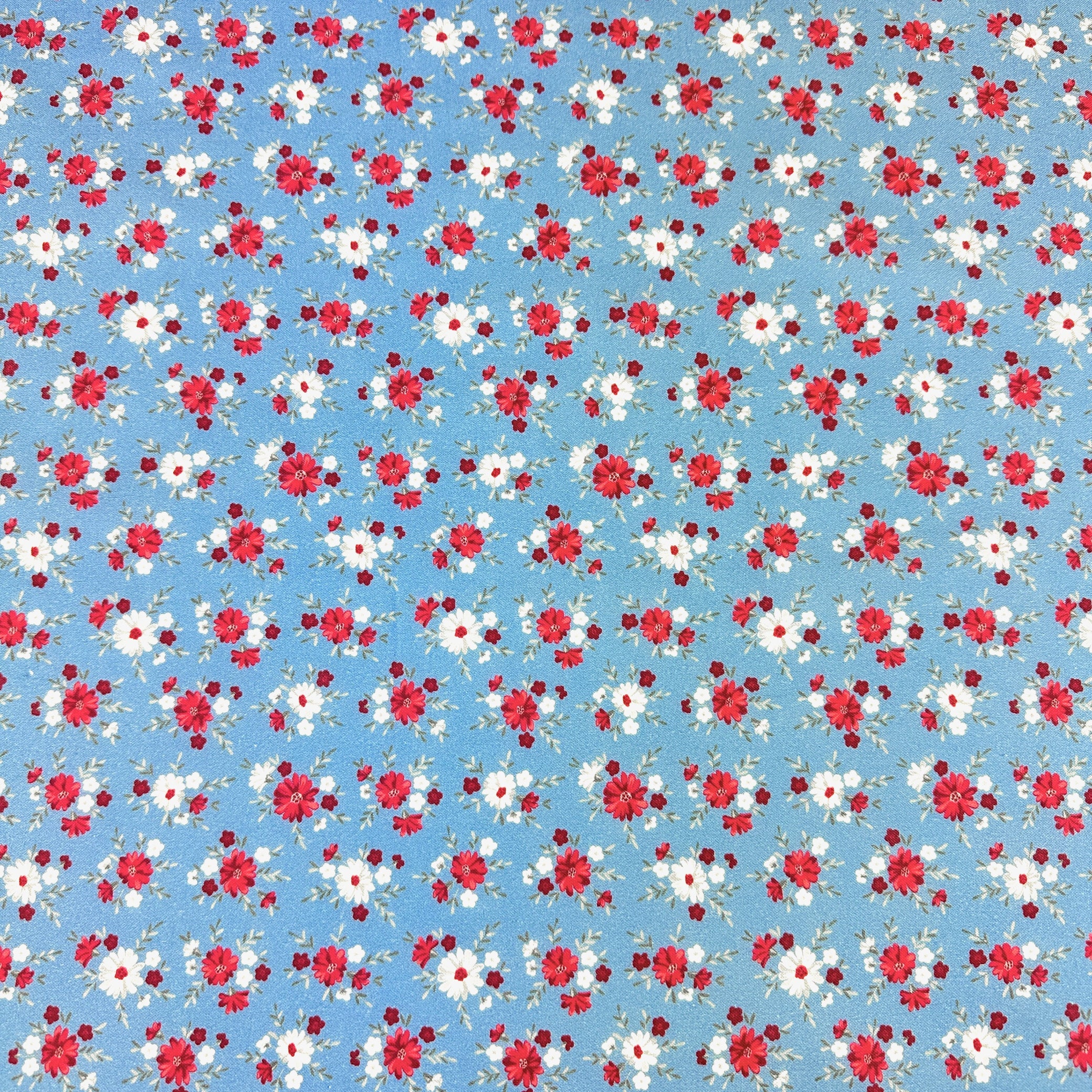 This cotton fabric by Satin Moon features a little bursts of flowers in red and white on a blue background.