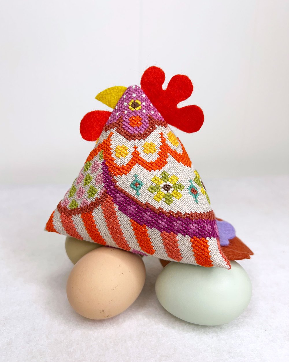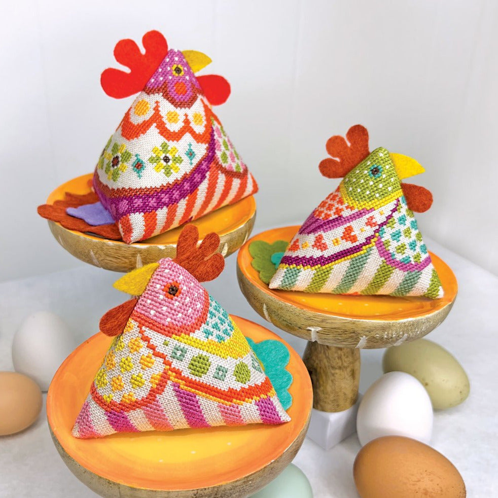 This printed cross stitch pattern by Satsuma Street features charming and cheeky chickens. Stitching up your own brood of Satsuma Street’s popular Funky Chickens is a breeze with this set of three counted cross stitch charts. Each chicken features a different cheeky phrase on the bottom: "What the cluck?!", "Guess what? Chicken butt", "For cluck's sake". Illustrated step-by-step self finishing instructions are included. They are stitched over 2 fabric threads on 28 ct linen. The pattern as stitched features Lecein Cosmo threads.