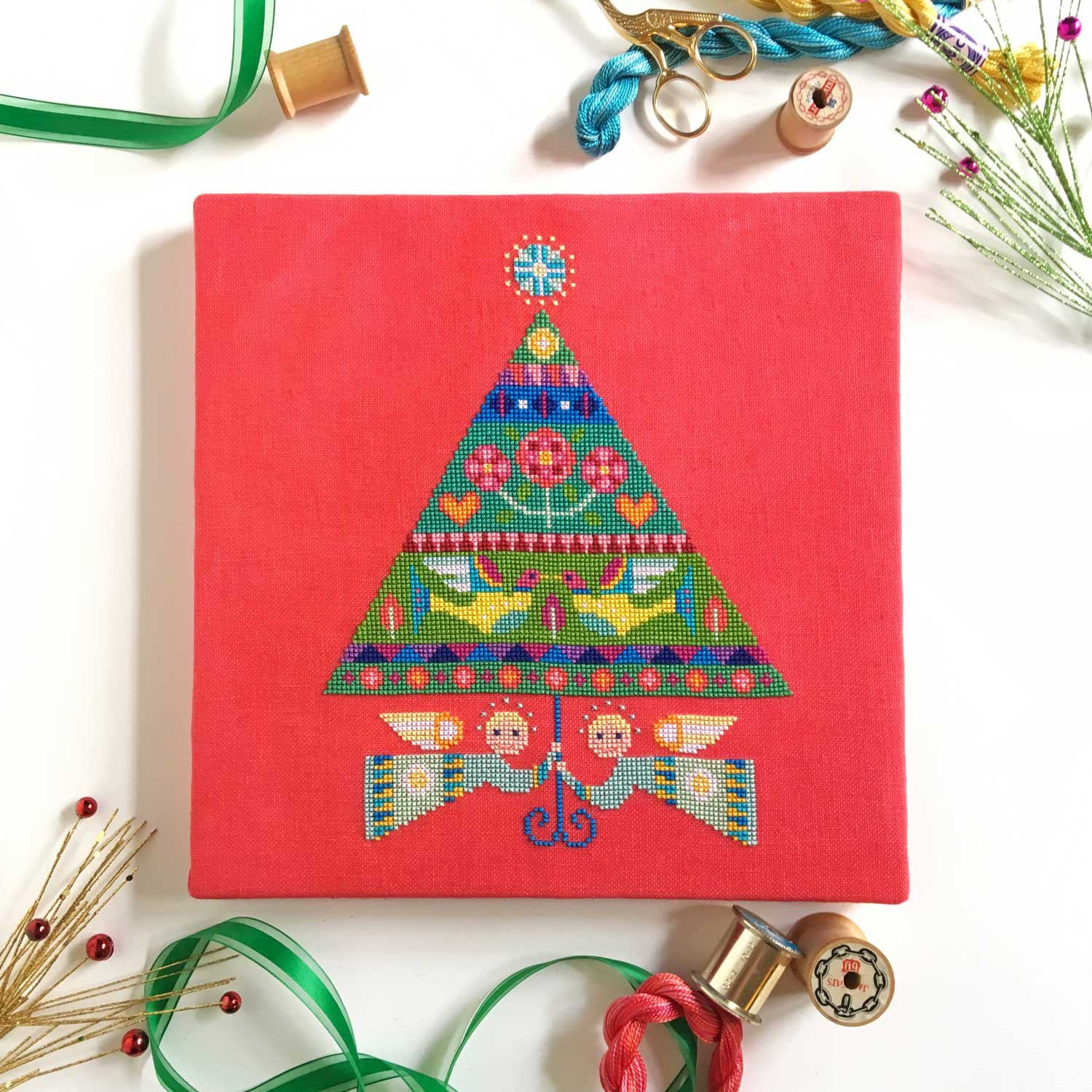 This is a printed cross stitch pattern by Satsuma Street. It features a triangular Christmas tree with colorful floral and geometric patterns, held up by two angels. The example as stitched uses DMC cotton floss on 30 count linen in Watermelon by Weeks Dye Works.
