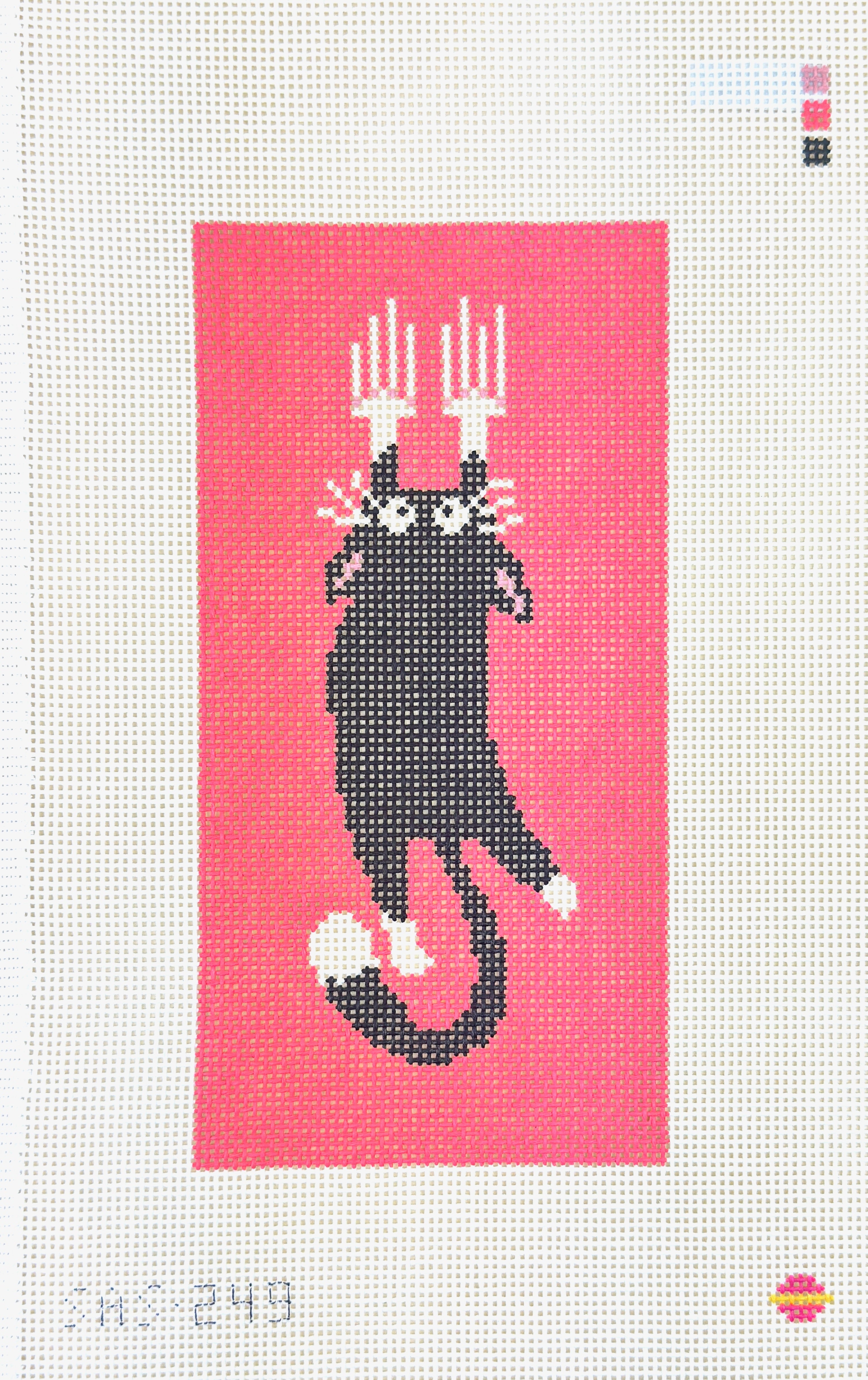 This is a hand-painted needlepoint canvas from Saturnalia Stitching. It features an black cat clinging to a pink tapestry in the background.