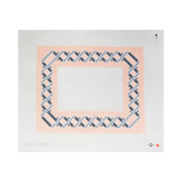 This hand painted needlepoint canvas by Saturnalia Stitching features a frame with a blue, white, and pink design.