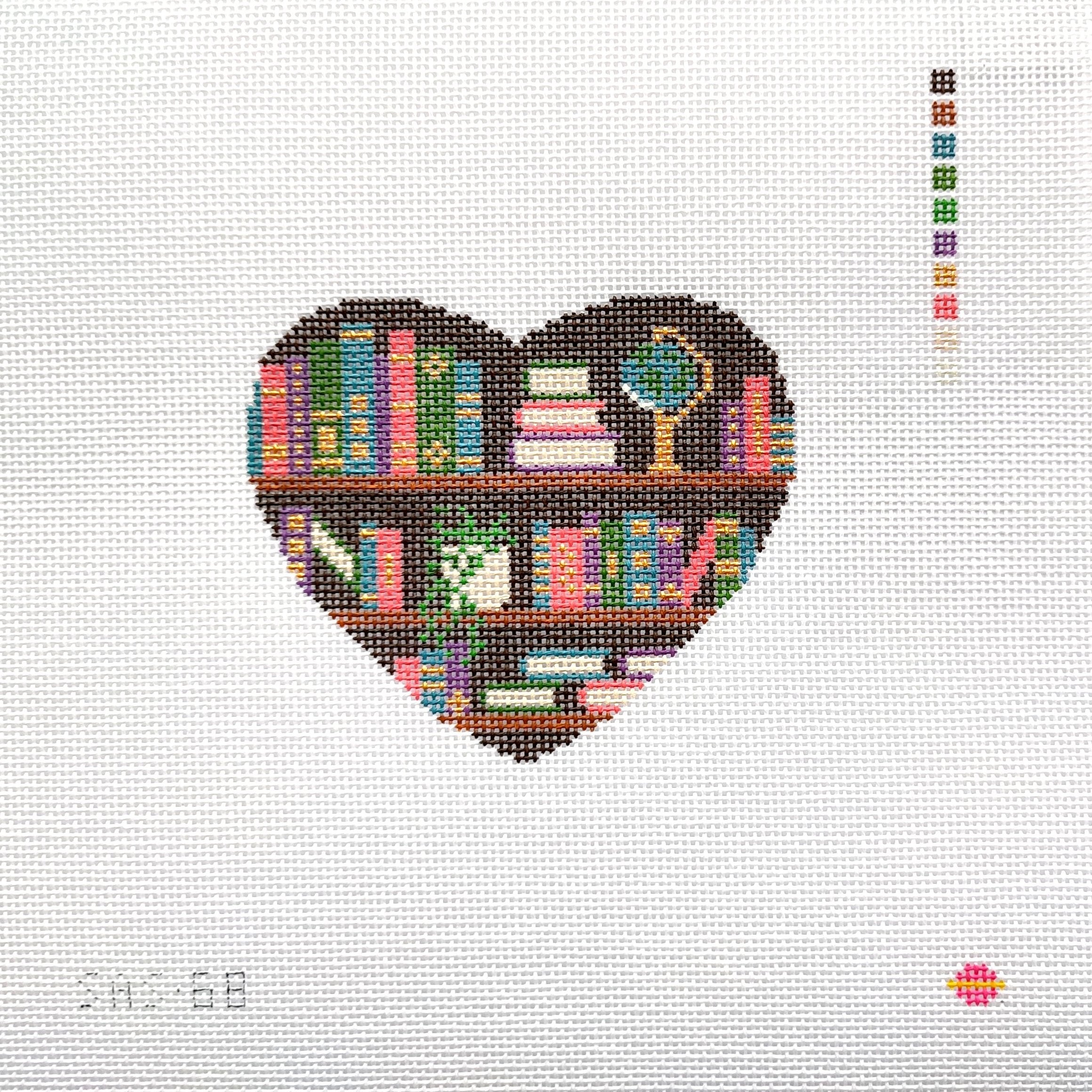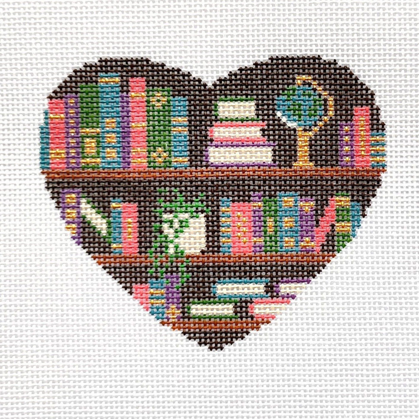 This hand painted needlepoint canvas by Saturnalia Stitching features a heart filled with books.