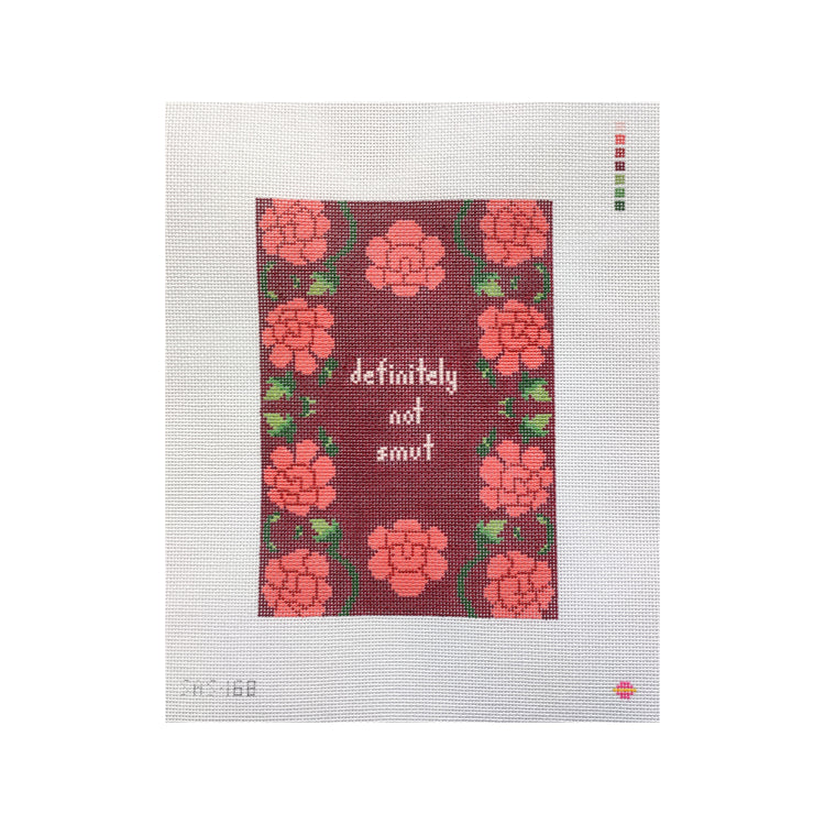 This hand painted needlepoint canvas from Saturnalia Stitching features a floral pattern and text stating "definitely not smut". It is designed to be finished into a case for an e-reader.