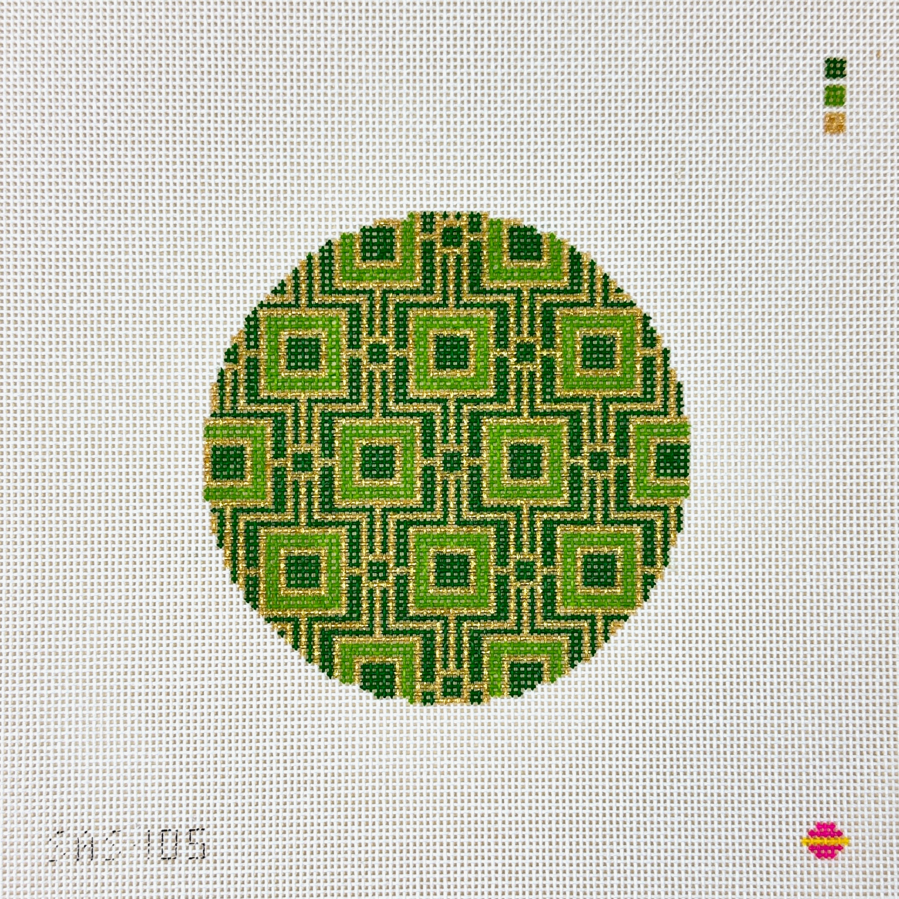 This is a hand painted needlepoint canvas from Saturnalia Stitching. It features a painting of an emerald design.