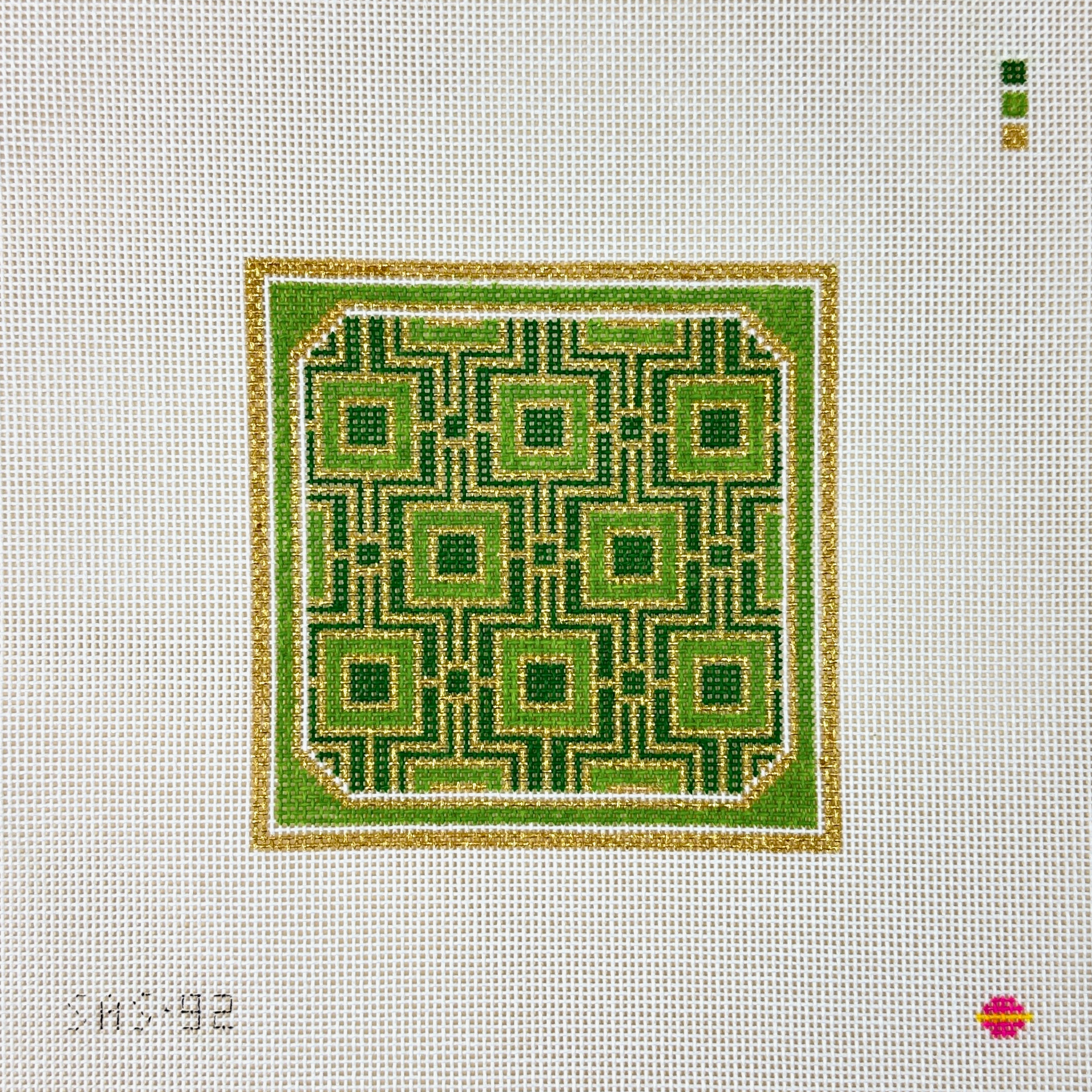 This is a hand painted needlepoint canvas from Saturnalia Stitching. It features a painting of a square with an emerald pattern on it.