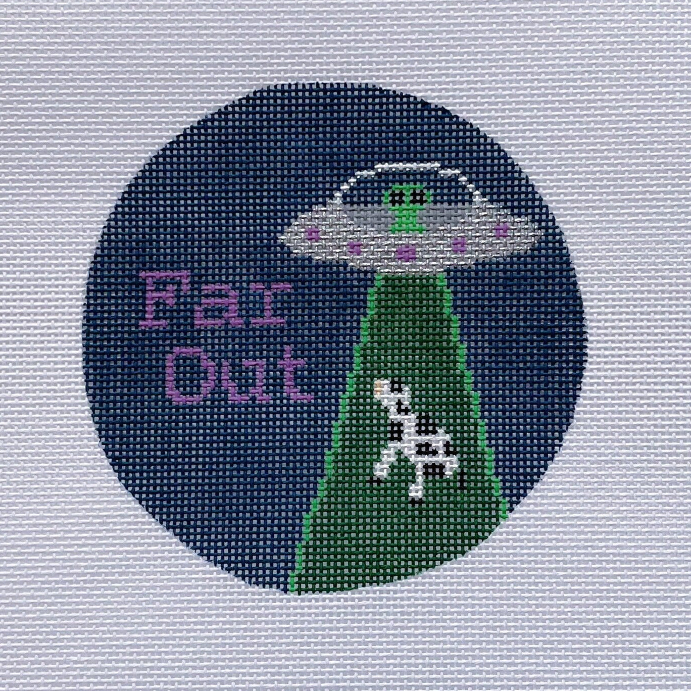 This hand painted needlepoint canvas by Saturnalia Stitching features cow being abducted by aliens with "Far out".