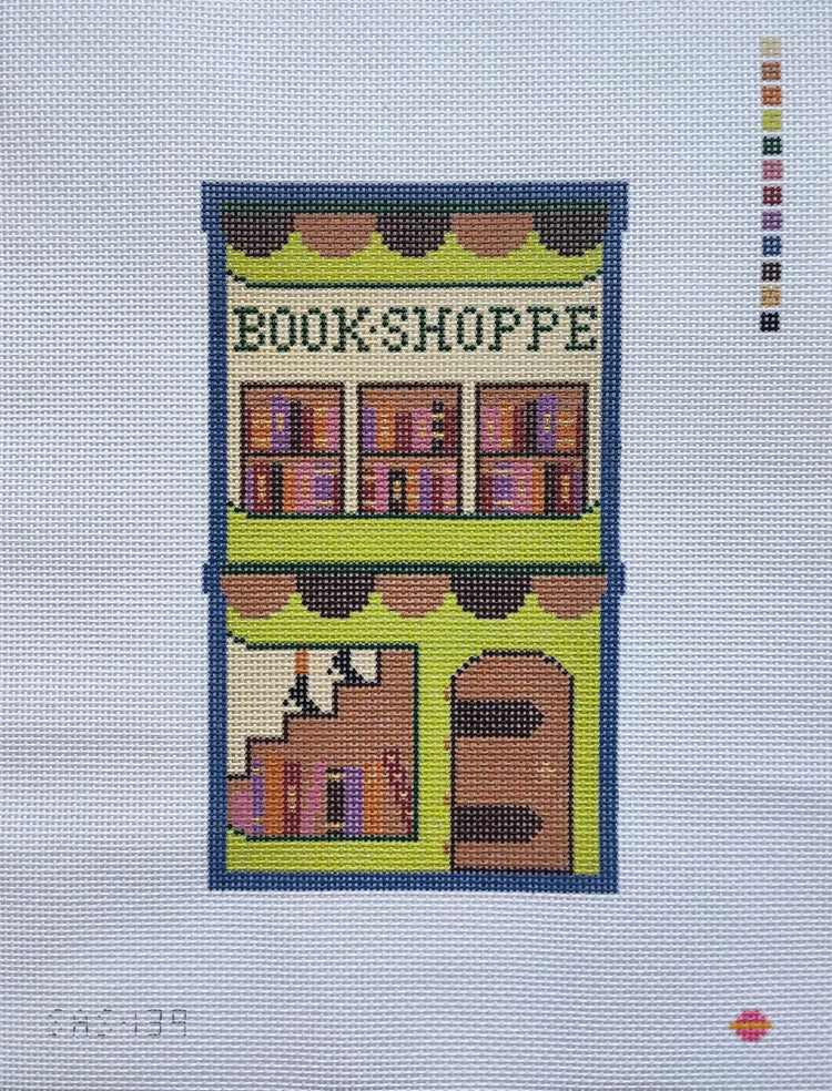 This hand painted Halloween needlepoint canvas by Saturnalia Stitching features a book shop called "Grimoires and Goodies".