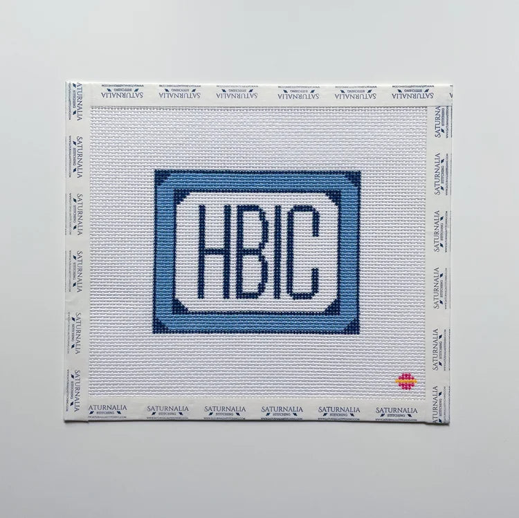 This is a hand painted needlepoint canvas from Saturnalia Stitching. It features a painting of a blue sign stating "HBIC".