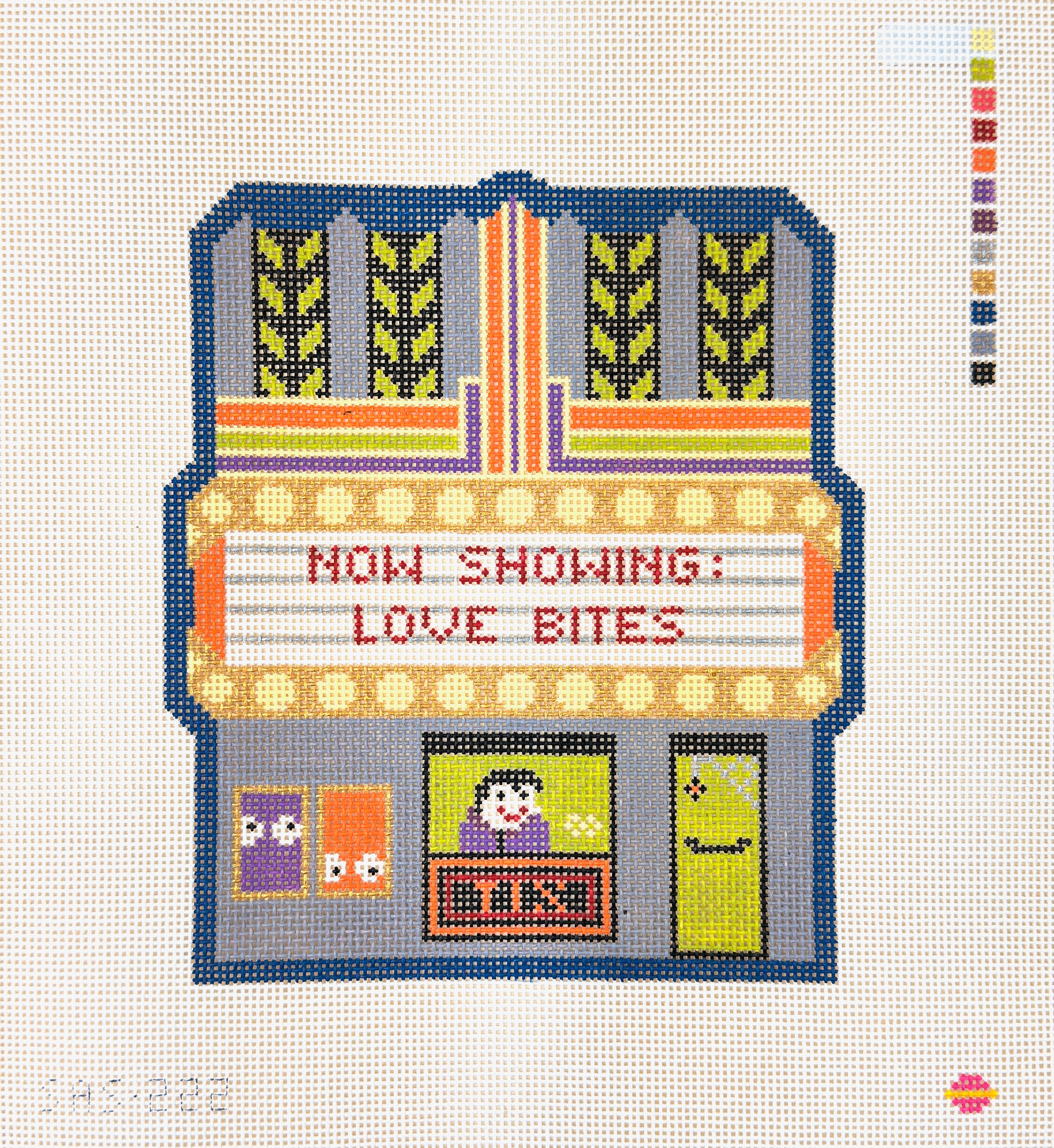 This is a hand-painted needlepoint canvas from Saturnalia Stitching. It features a horror themed movie theater.