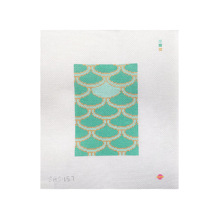 This is a hand painted needlepoint canvas from Saturnalia Stitching. It features a painting of a green passport cover with a geometric pattern inside it.