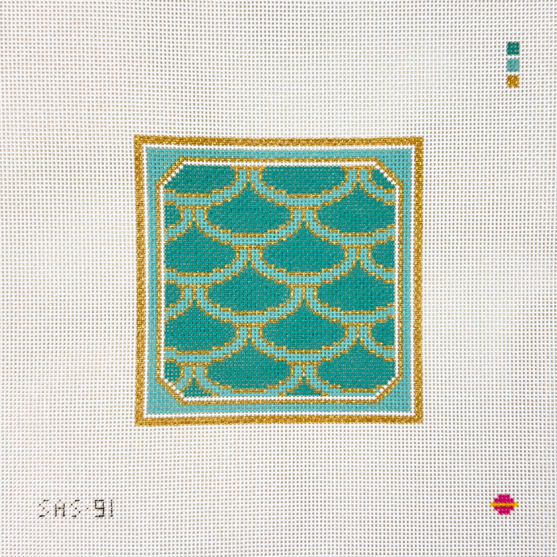 This is a hand painted needlepoint canvas from Saturnalia Stitching. It features a painting of a square with a wavey pattern on it.