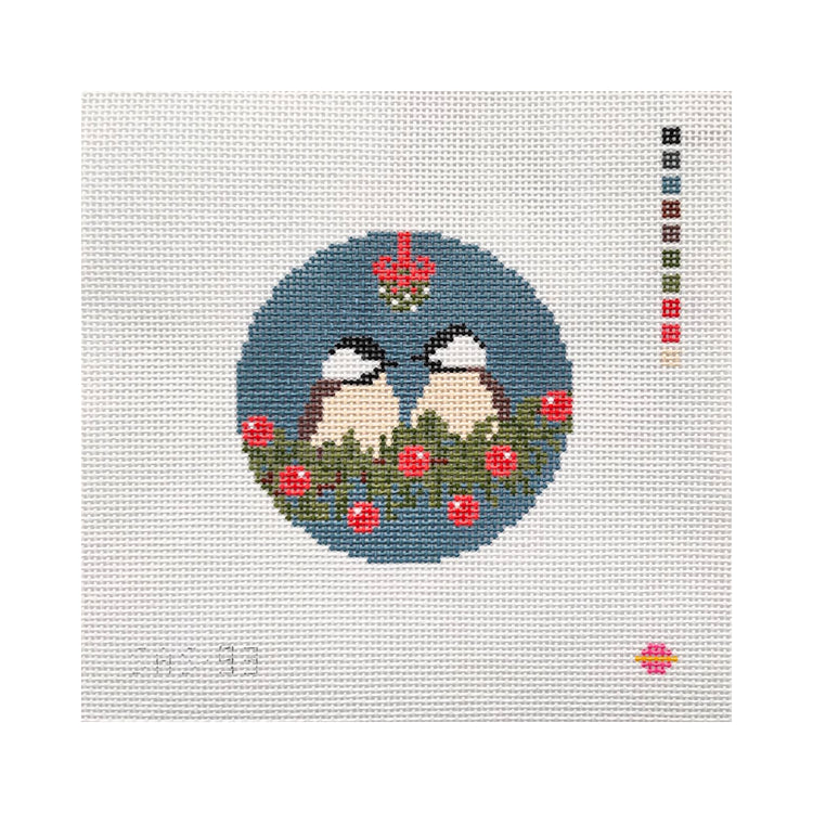 This is a hand painted needlepoint canvas from Saturnalia Stitching. It features an adorable painting of two chickadees nestled together in a bushel of holly.