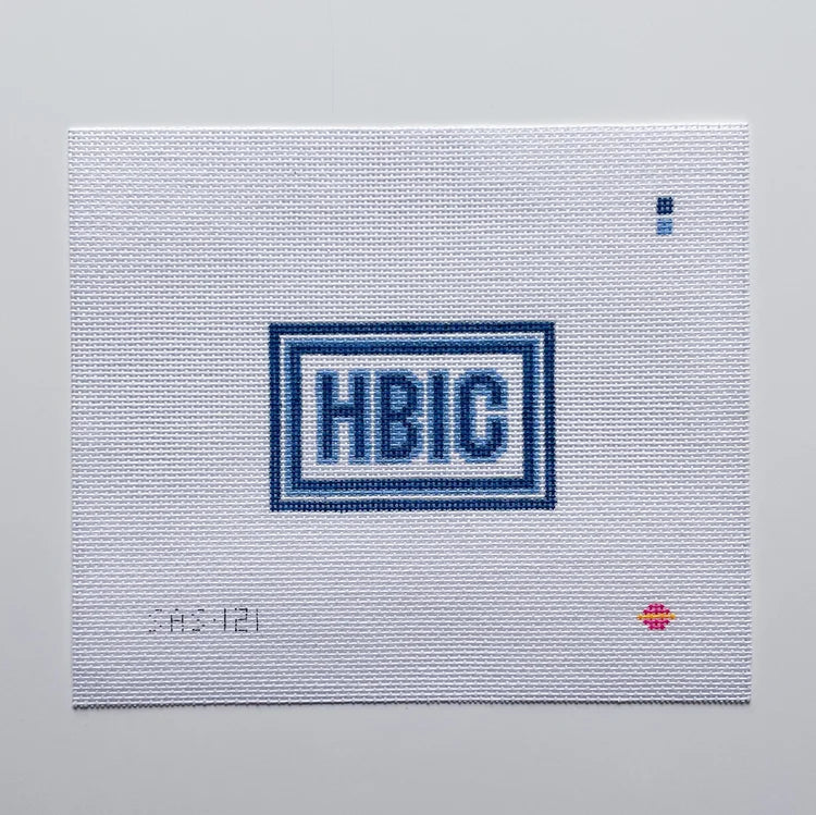 This is a hand painted needlepoint canvas from Saturnalia Stitching. It features a painting of a miniature blue sign stating "HBIC".