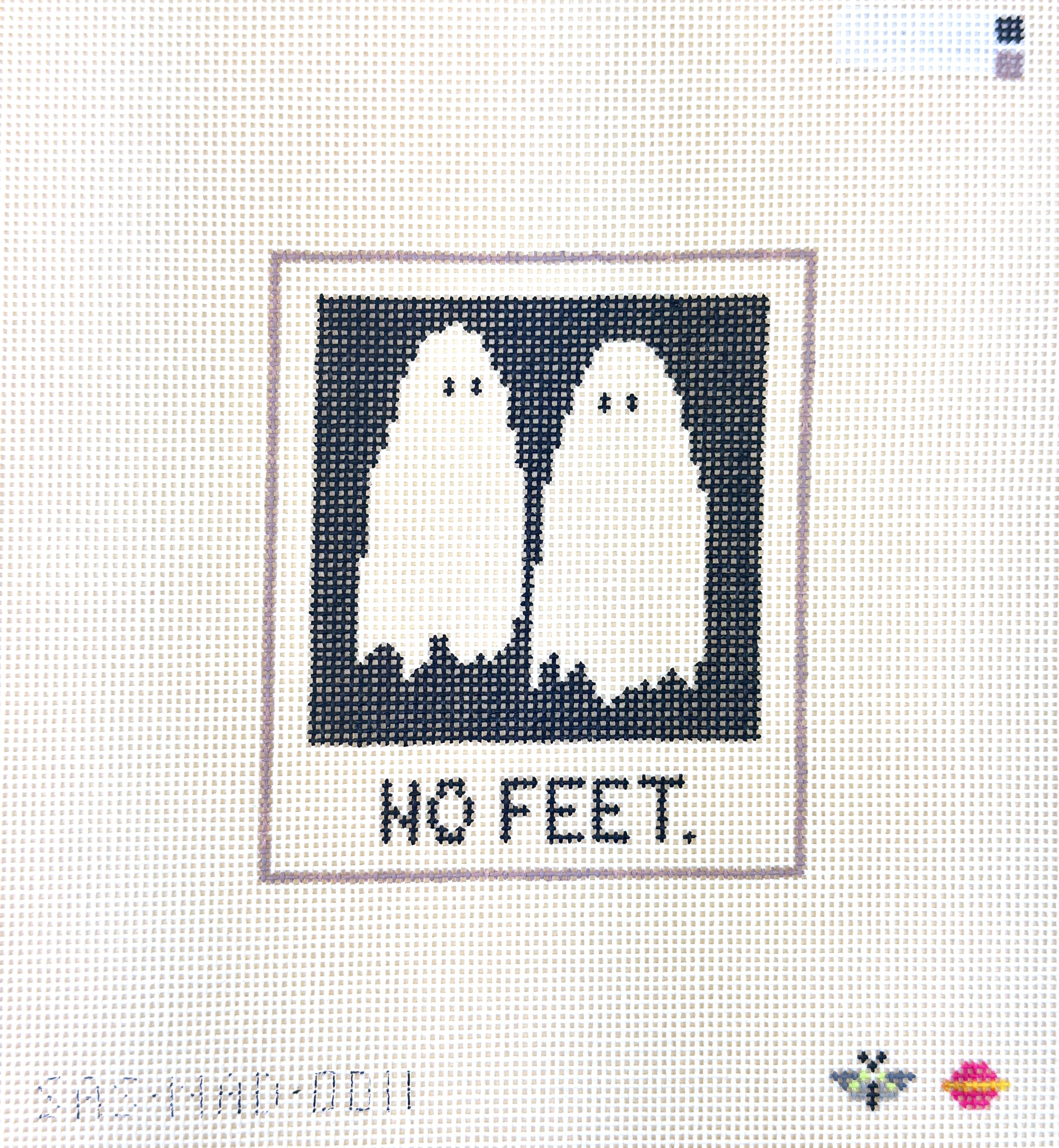 This is a hand-painted needlepoint canvas by Needlepoint After Dark from Saturnalia Stitching. It features two ghosts in a polaroid-styled frame, without any feet!