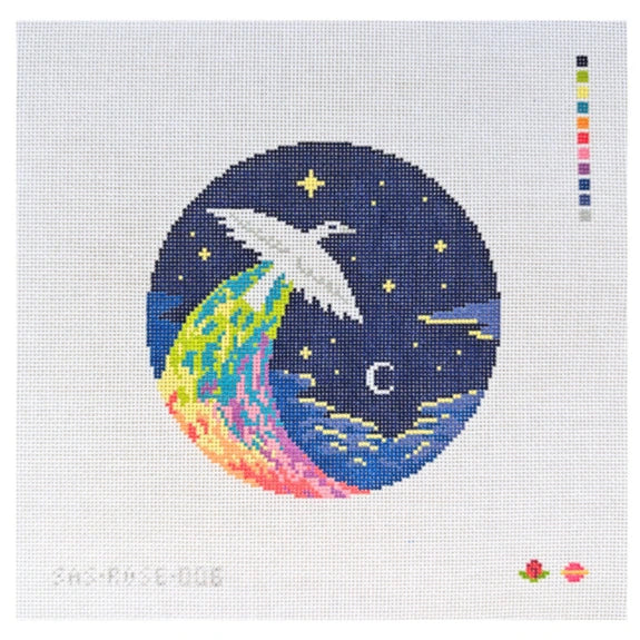 This is a hand painted needlepoint canvas by Rose Acolyte for Saturnalia Stitching. It features a painting of a beautiful bird flying across the night sky.