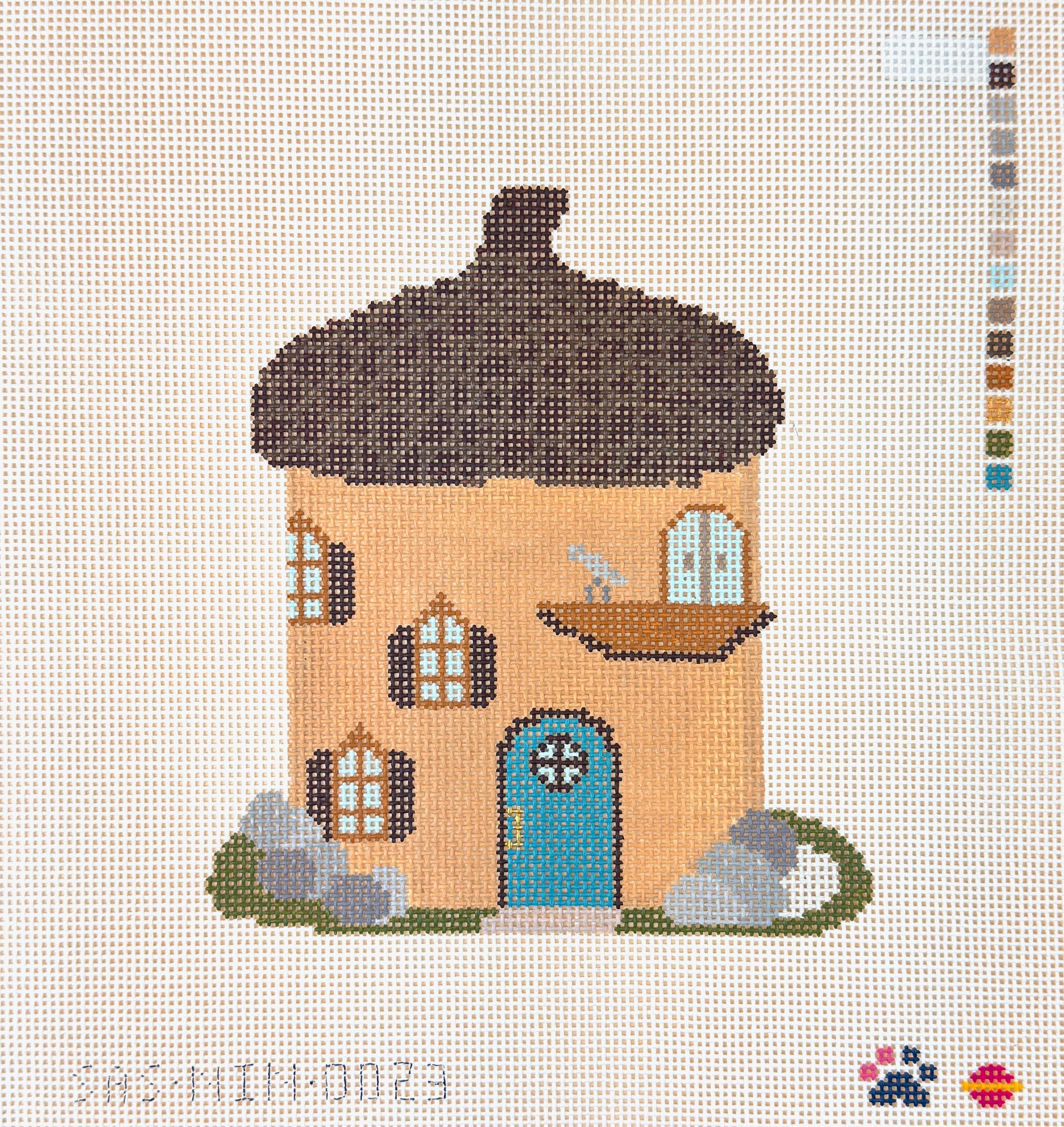 This is a hand-painted needlepoint canvas by Nine Lives Needlepoint from Saturnalia Stitching. It features a house made out of an acorn.