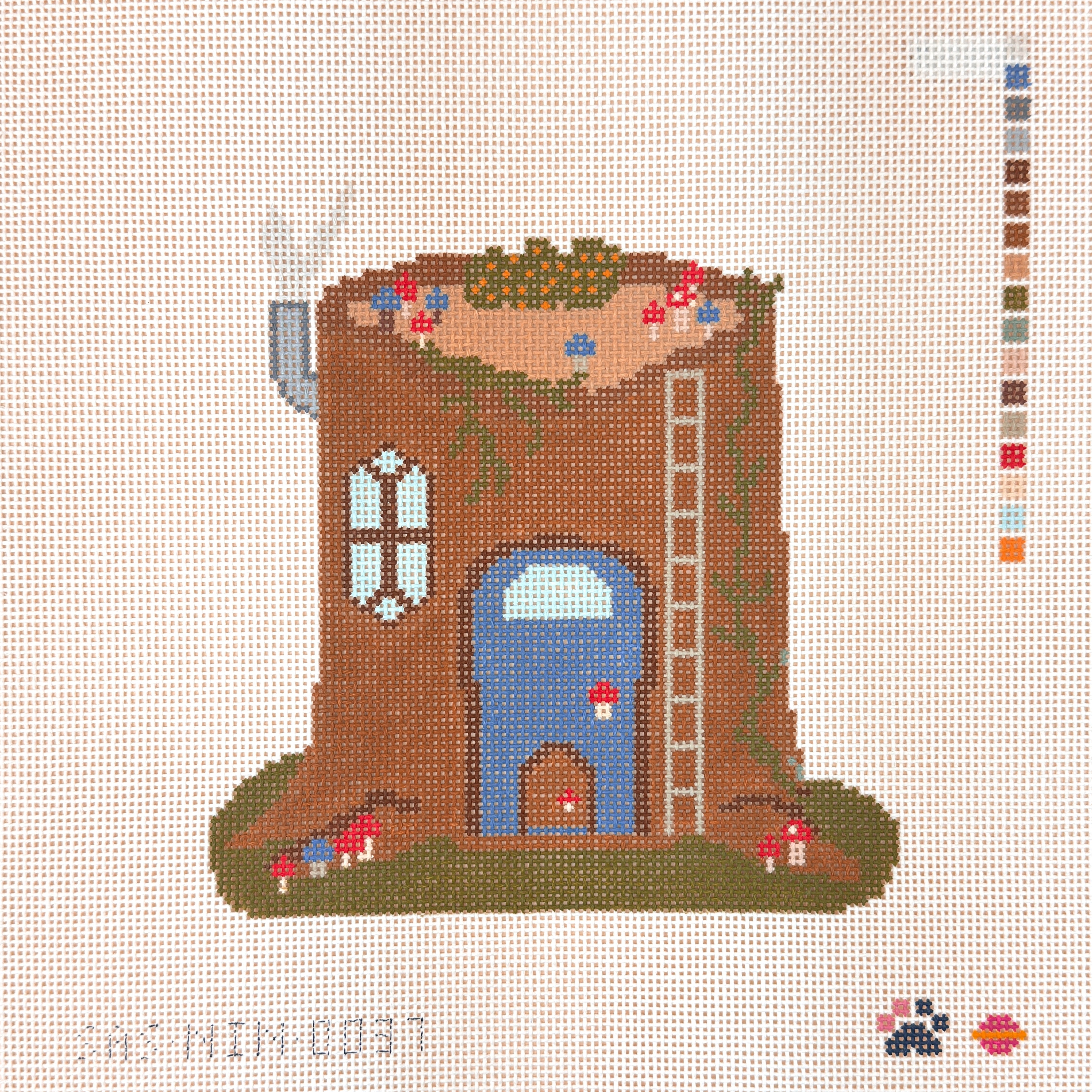 This is a hand-painted needlepoint canvas by Nine Lives Needlepoint from Saturnalia Stitching. It features a house made out of a tree stump.