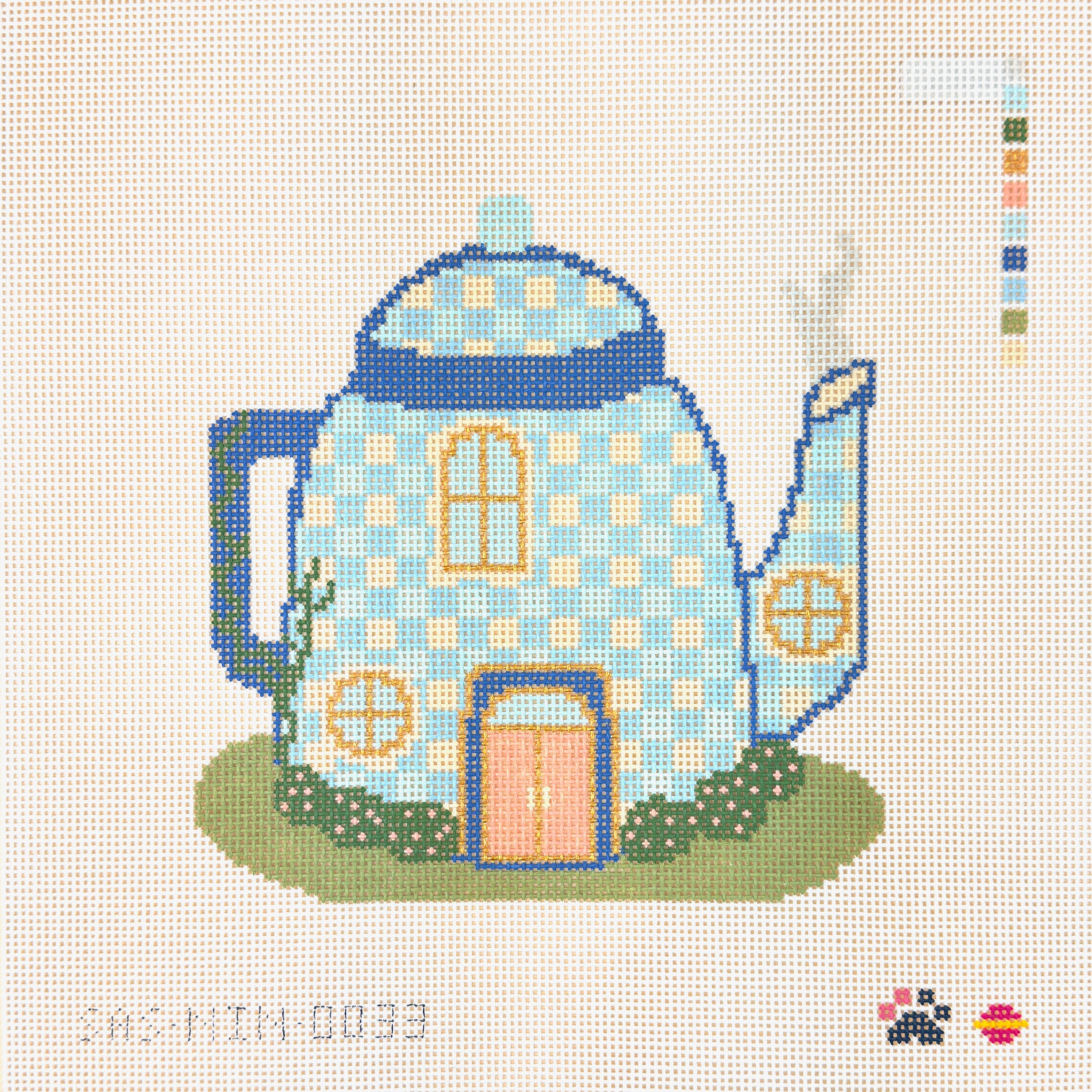 This is a hand-painted needlepoint canvas by Nine Lives Needlepoint from Saturnalia Stitching. It features a house made out of a tea pot.