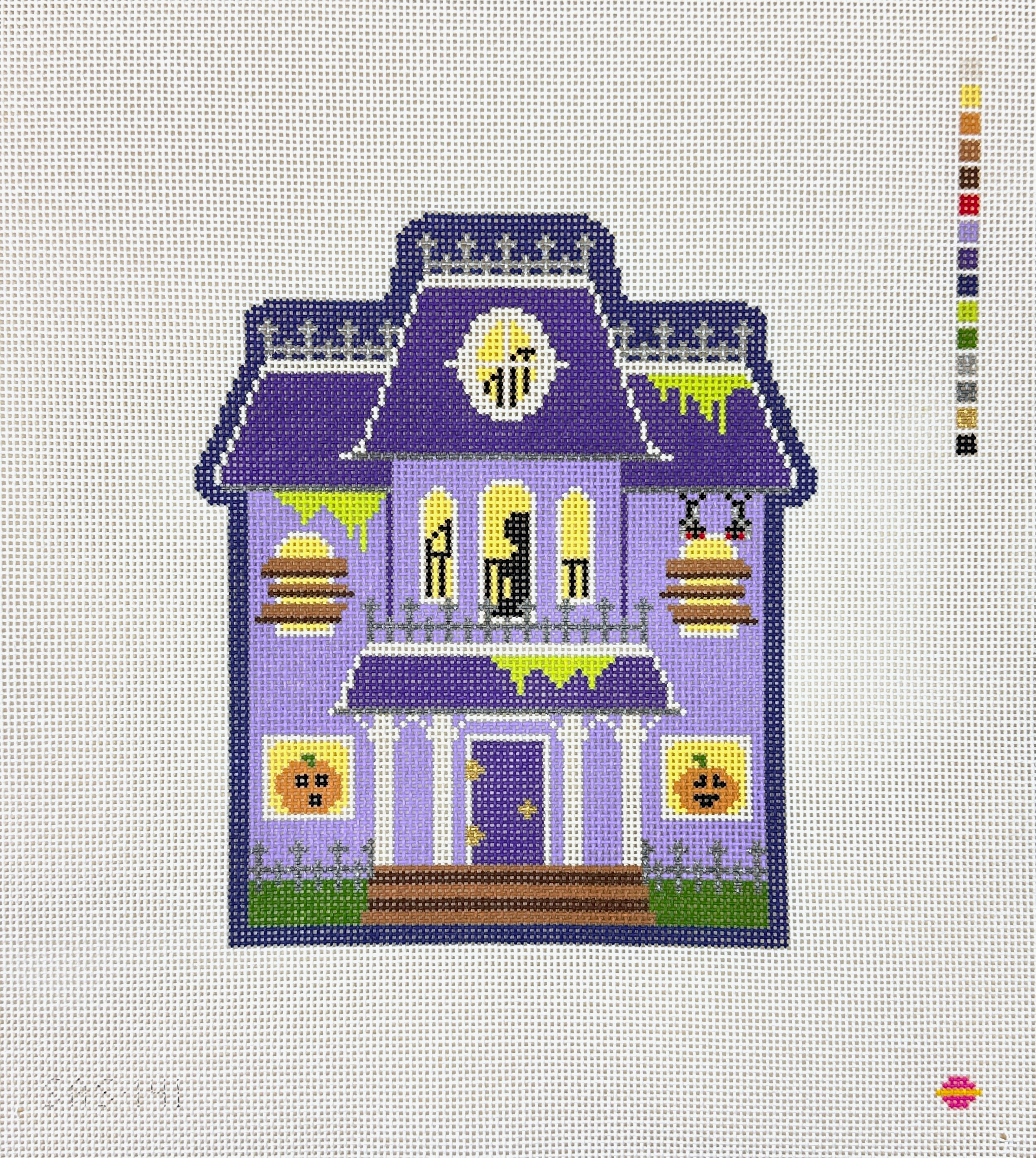 This hand painted Halloween needlepoint canvas by Saturnalia Stitching features a haunted house.