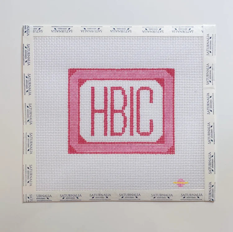 This is a hand painted needlepoint canvas from Saturnalia Stitching. It features a painting of a pink sign stating "HBIC".