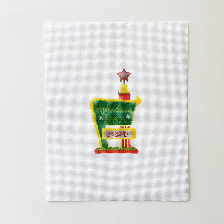 This is a hand painted needlepoint canvas from Saturnalia Stitching. It features a painting with a road sign advertising a holiday inn.