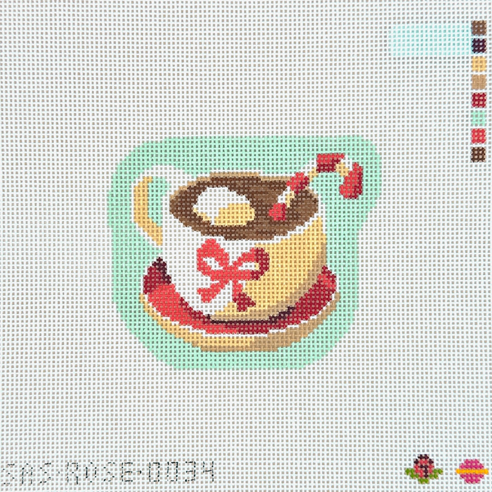 This is a hand painted needlepoint canvas by Rose Acolyte from Saturnalia Stitching featuring a mug of peppermint hot cocoa on 18 mesh.