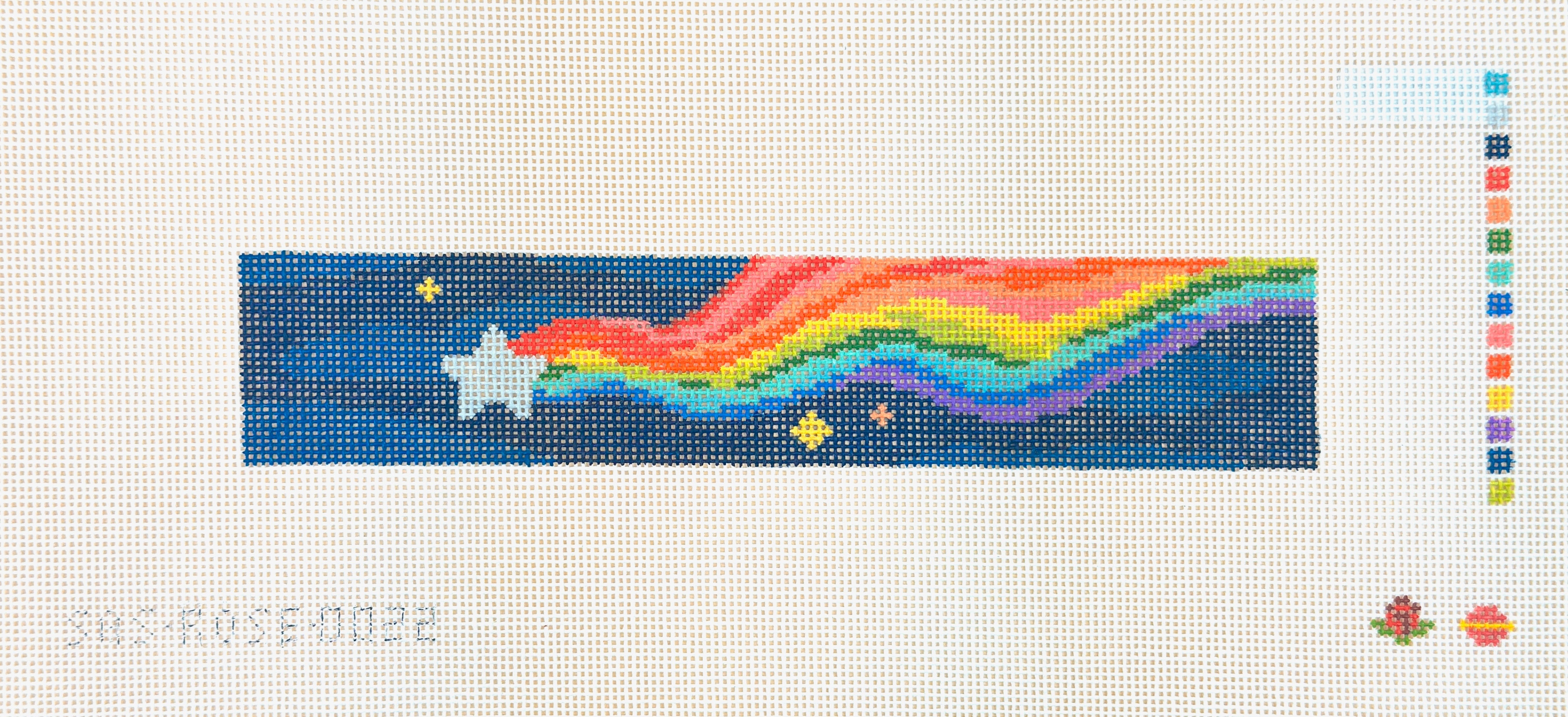 This is a hand-painted needlepoint canvas by Rose Acolyte from Saturnalia Stitching. It features a star and rainbow trailing through space.