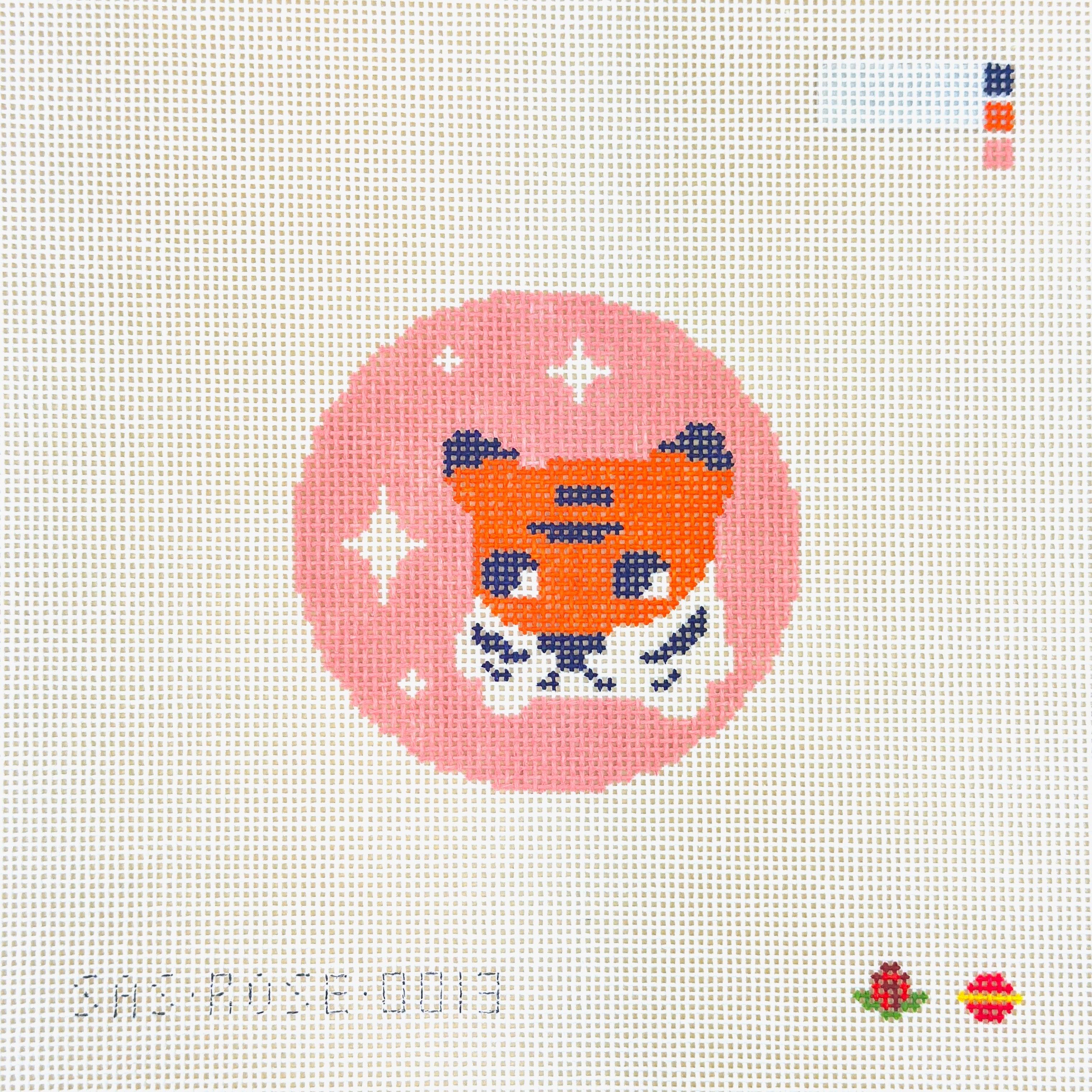 This is a hand-painted needlepoint canvas by Rose Acolyte from Saturnalia Stitching. It features a cute tiger's face in a pink round.