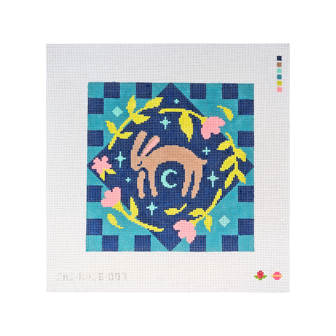 This hand painted needlepoint canvas by Rose Acolyte for Saturnalia Stitching features a sweet bunny sleeping on a starry sky background.