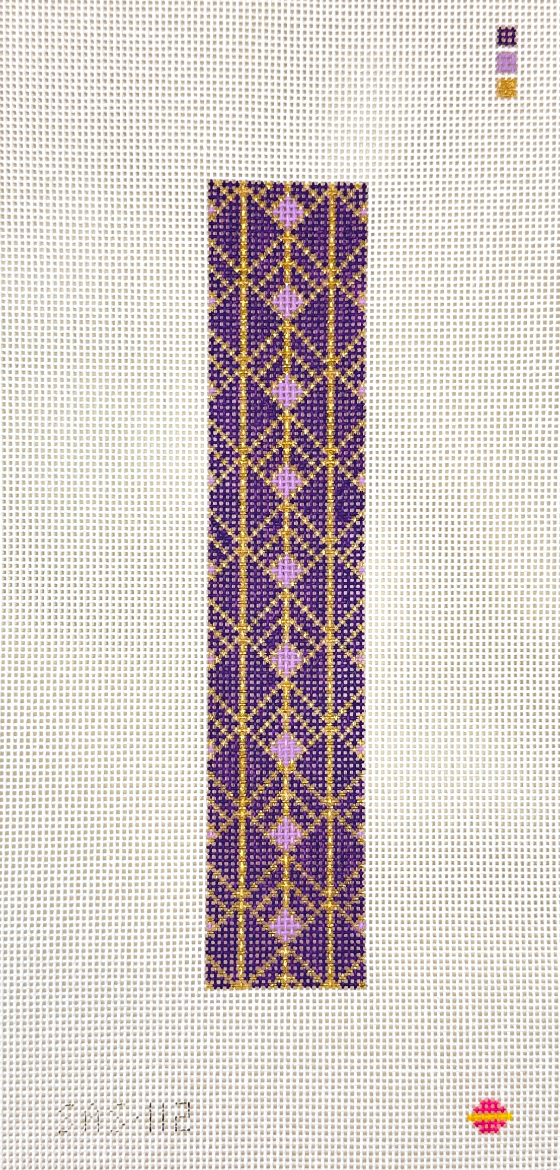 This is a hand painted needlepoint canvas from Saturnalia Stitching. It features a painting with a regal pattern. This canvas is intended to be finished as a key fob or a bookmark.