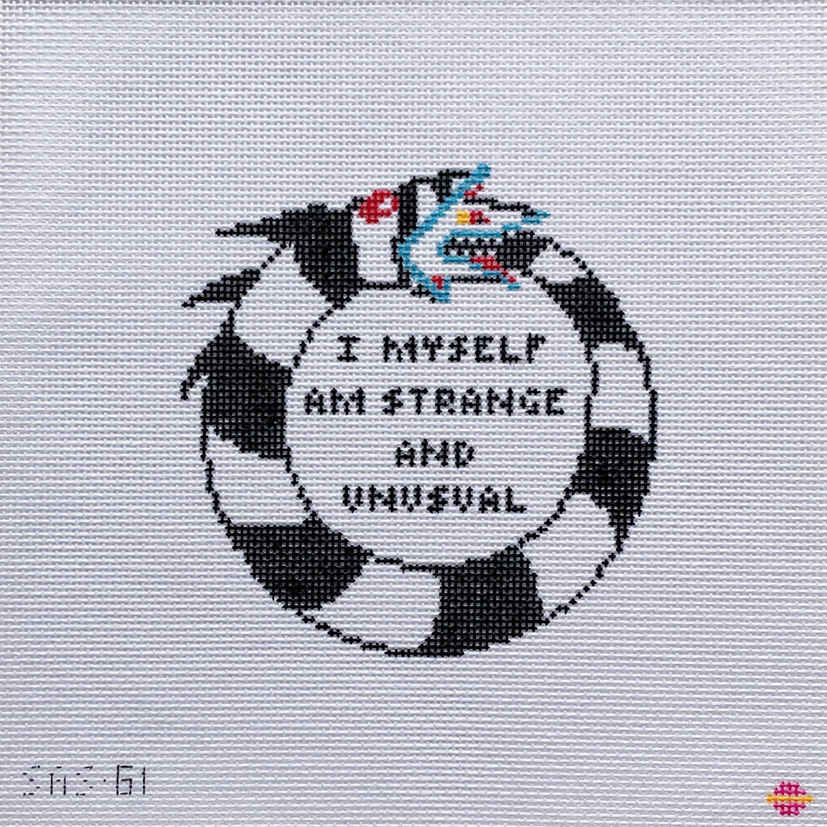 This hand painted needlepoint canvas by Saturnalia Stitching features the iconic sandworm from the movie Beetlejuice with "I myself am strange and unusual" in the center.