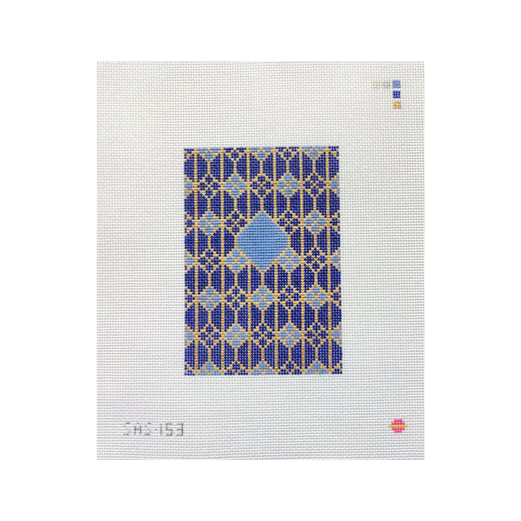 This is a hand painted needlepoint canvas from Saturnalia Stitching. It features a painting of a blue passport cover with a sapphire geometric pattern inside it.