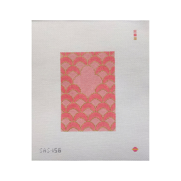 This is a hand painted needlepoint canvas from Saturnalia Stitching. It features a painting of a pink passport cover with a geometric seashell pattern inside it.