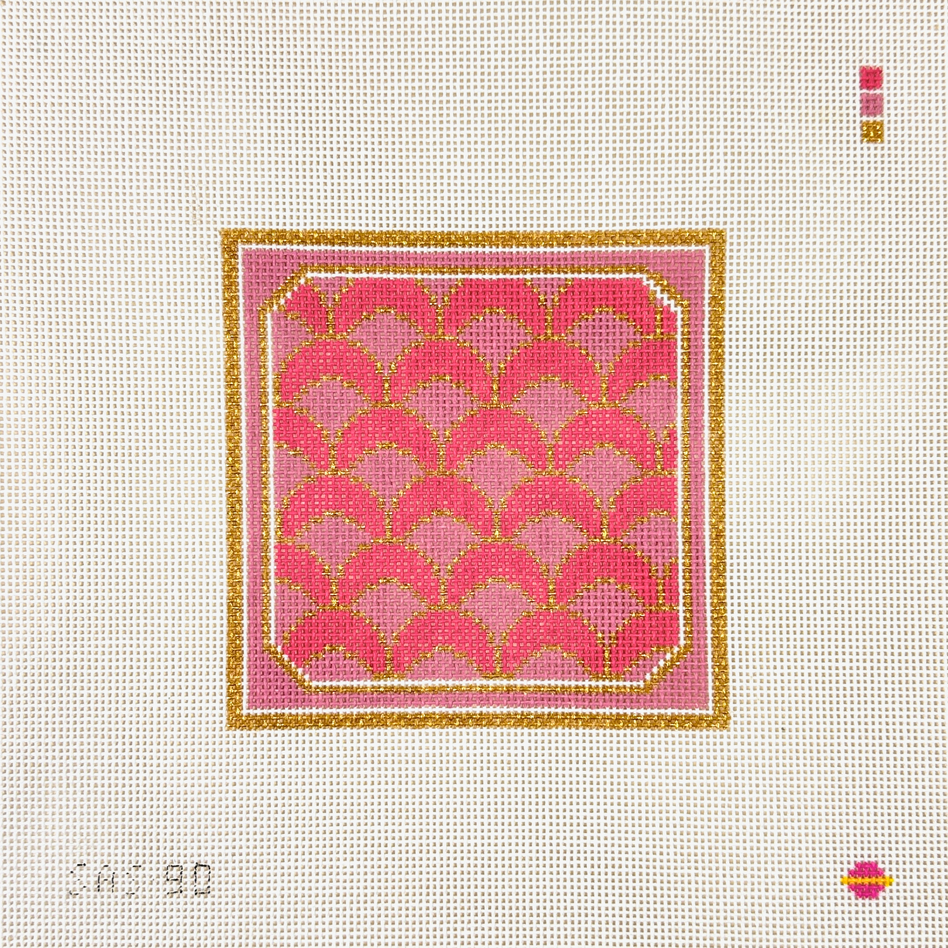This is a hand painted needlepoint canvas from Saturnalia Stitching. It features a painting of a square with a seashell pattern on it.