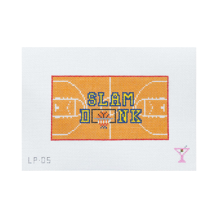 This is a hand painted needlepoint canvas by The City Stitcher from Saturnalia Stitching. It features a painting of a basketball court with "slam dunk" written on it.