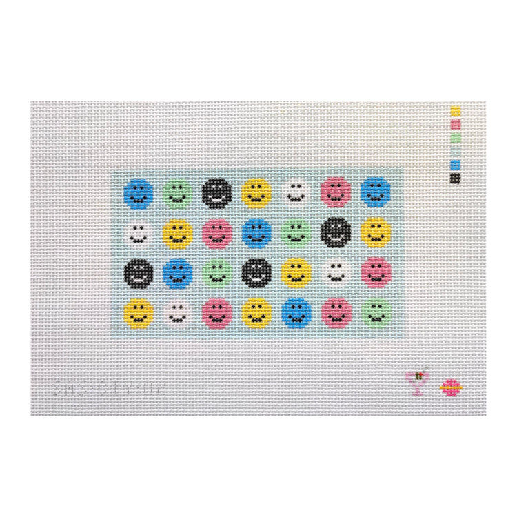 This is a hand painted needlepoint canvas from Saturnalia Stitching. It features a painting of several smiley faces. This canvas is intended to be finished as a clutch.